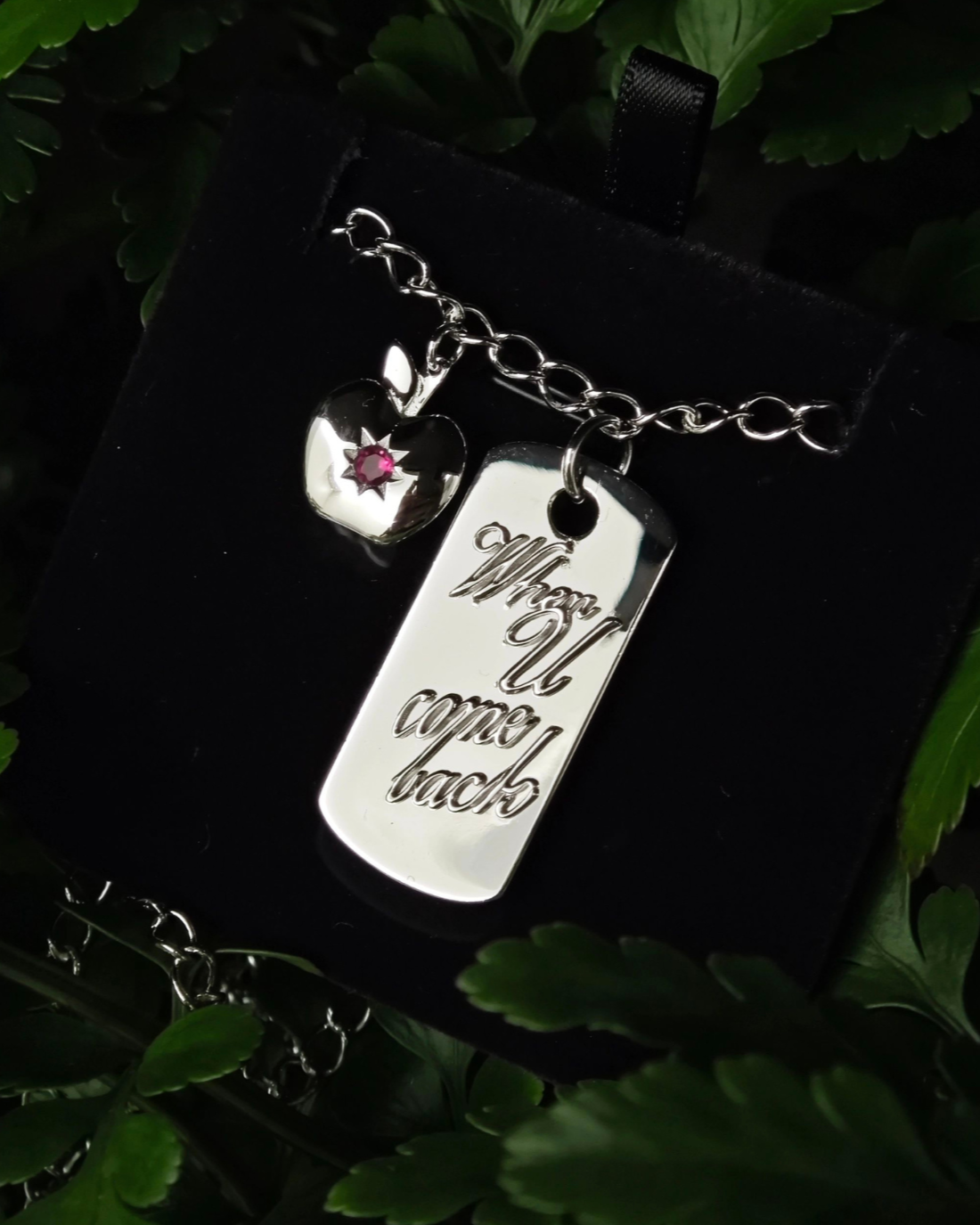 This necklace is based on the meaningful gift given to him by MC in the game—an item he keeps close to his heart. The pendant is engraved on both sides with the words: “When you come back.” Designed to have a substantial weight, the apple charm and the tag create a soft jingling sound with movement.