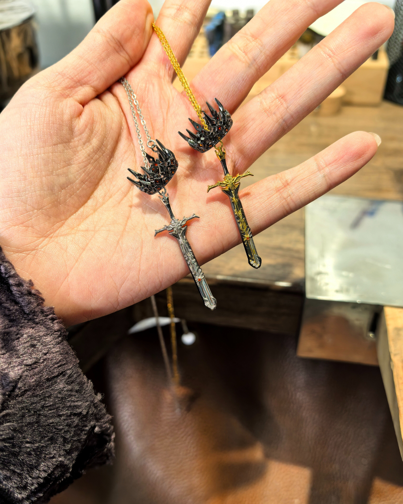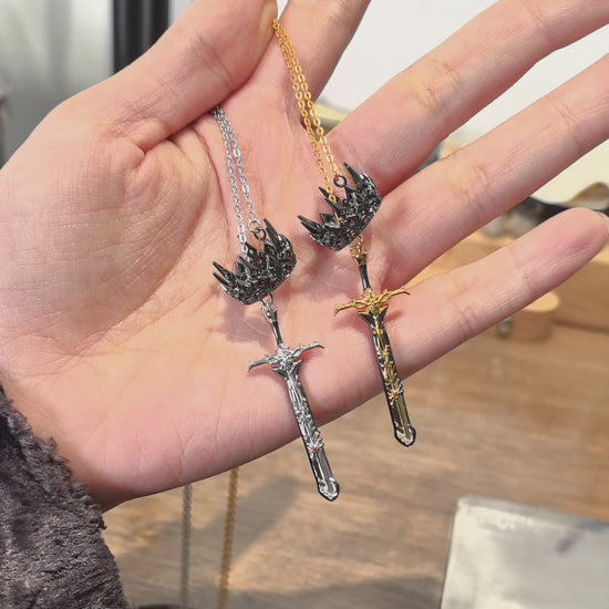 Inspired by Xavier’s King of Darknight look, this necklace features a regal crown set with six red princess-cut garnet stones. Hidden within the crown is a retractable mechanism that allows you to freely adjust its position along the chain. The sword beneath the crown is plated in a striking tri-color finish—black, white, and yellow gold—capturing both elegance and power in a single, dynamic piece.