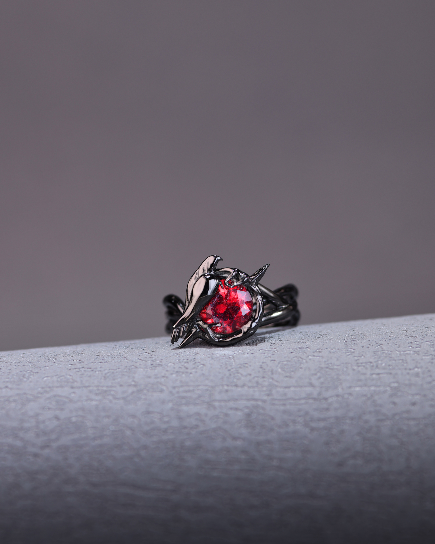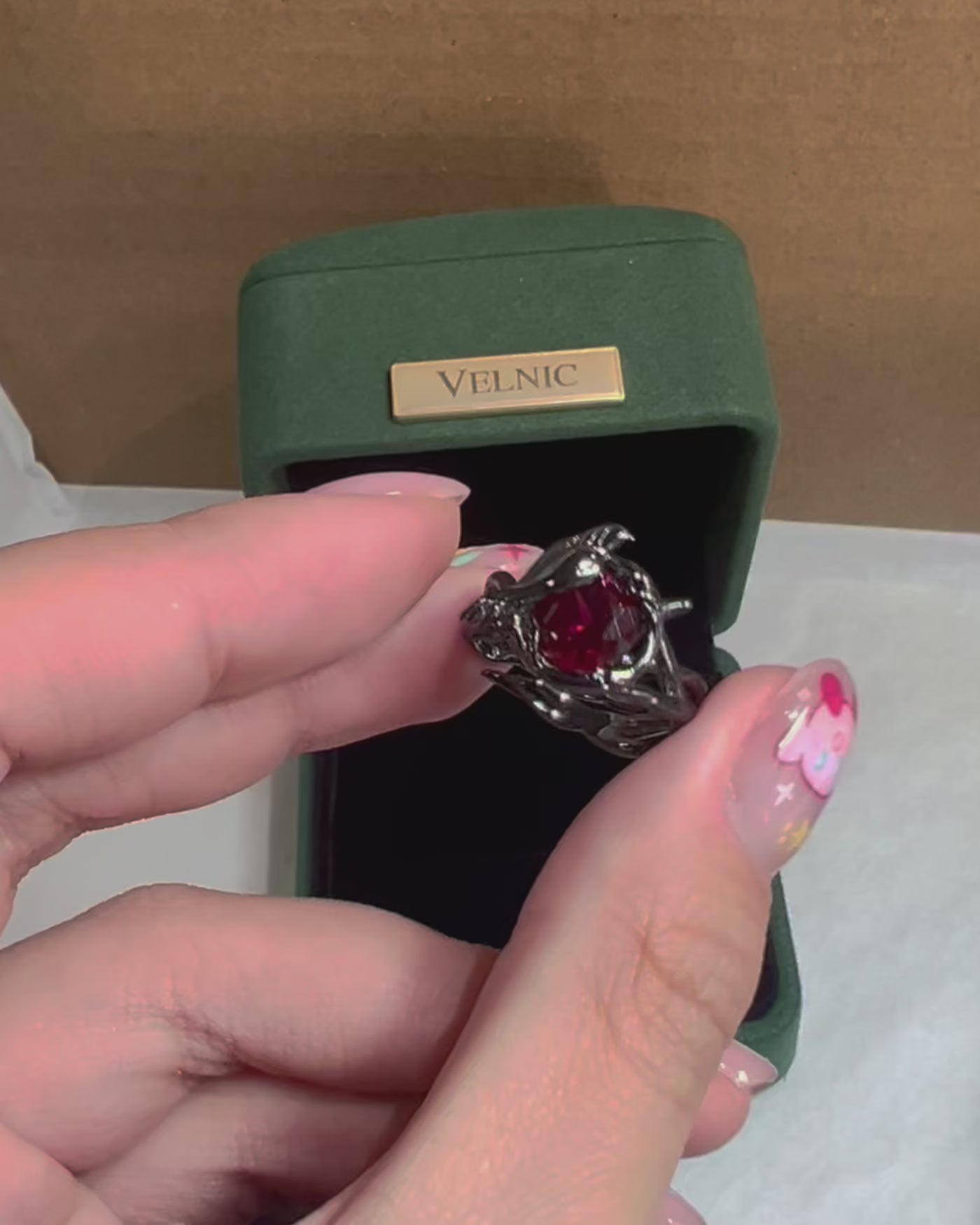Inspirée de Sylus dans Love and Deepspace , cette bague est ornée d'un rubis synthétique de 2,5 carats, serti d'un motif représentant un corbeau noir et des vignes torsadées. L'anneau, orné de détails complexes noirs rappelant des vignes, est réglable en deux parties, du 4 au 11 US.
