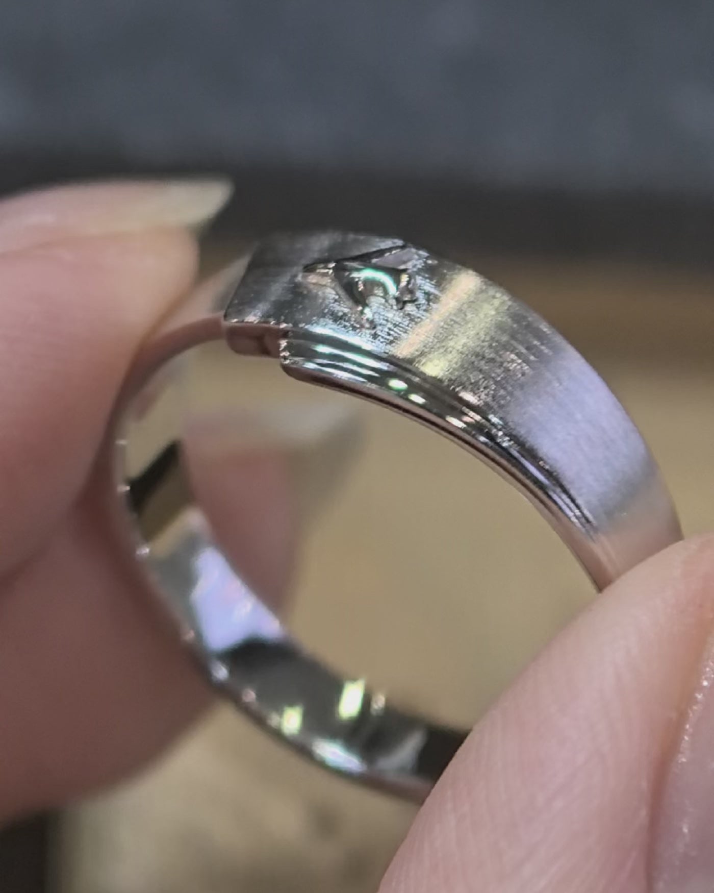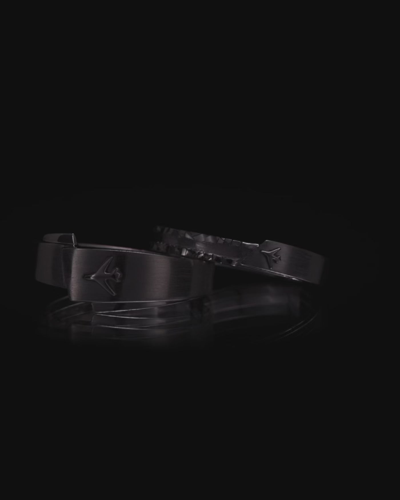 Affinity Level 100 Ring — a finely brushed men’s ring engraved with a tiny airplane, its surface catching the light with quiet brilliance. No matter where the plane flies, your hand remains its home—its final landing place.