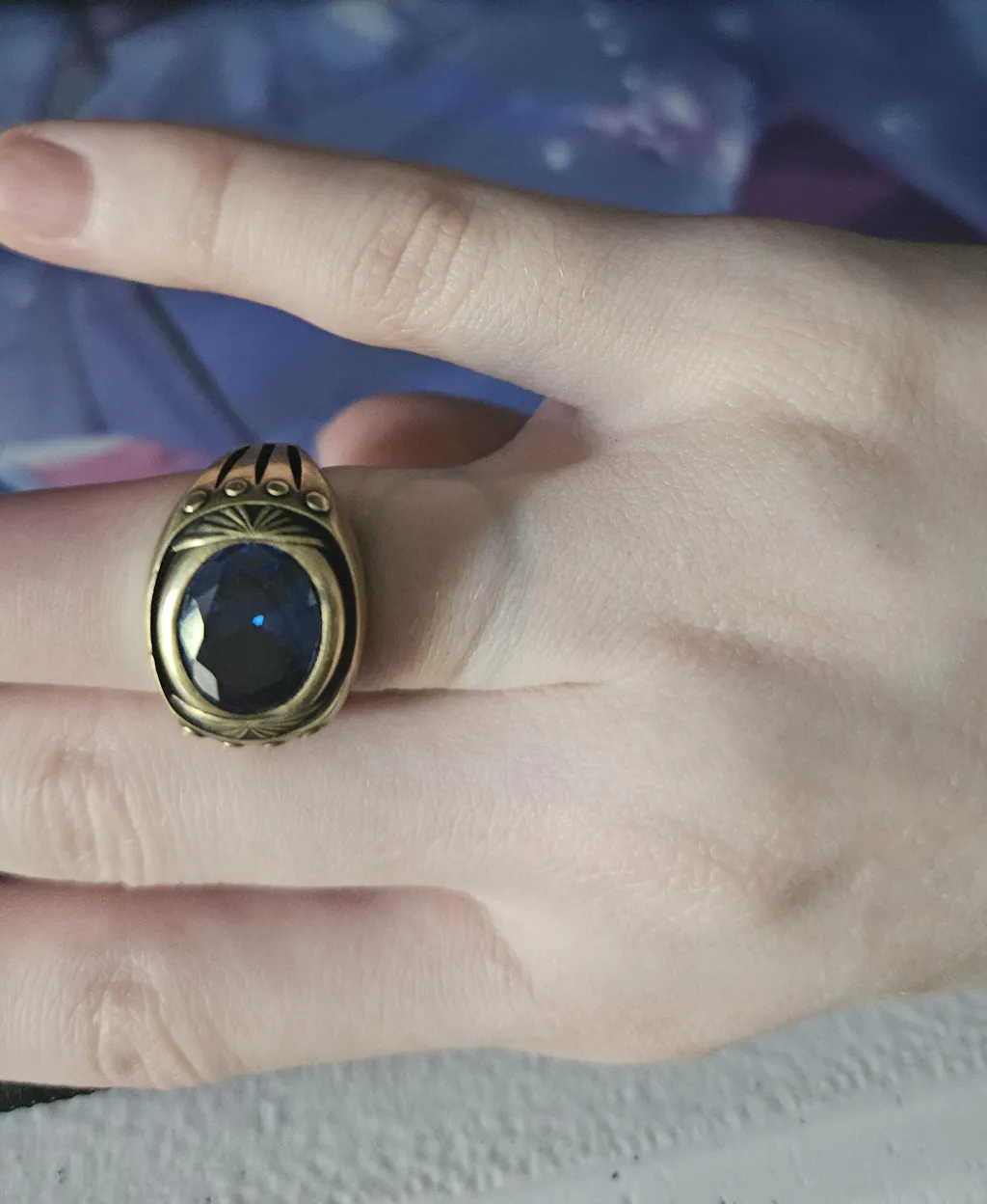 As a Raf main, I was really hoping to wear this ring every day because it’s absolutely beautiful and it’s a subtle way for me to show my affection. Unfortunately, since it’s made of brass, it turns my finger green pretty quickly… even after just a few minutes, it’s quite noticeable. I was hoping that the ring I received would be sealed to prevent that, but unfortunately it doesn’t seem to be. I considered putting it on a necklace but I’m having a hard time finding a necklace that would suit the piece. The fact that under the ring is empty makes it feel lighter, but also would look a bit odd on a necklace. It’s honestly such a stunning ring, I love what it represents and would love to show it off to my friends, but with the skin discoloration, I’m not sure I can wear it as often as I wanted to. Regardless it’s gorgeous and you can tell they tried to make it similar to Rafa’s ring on the game 💕