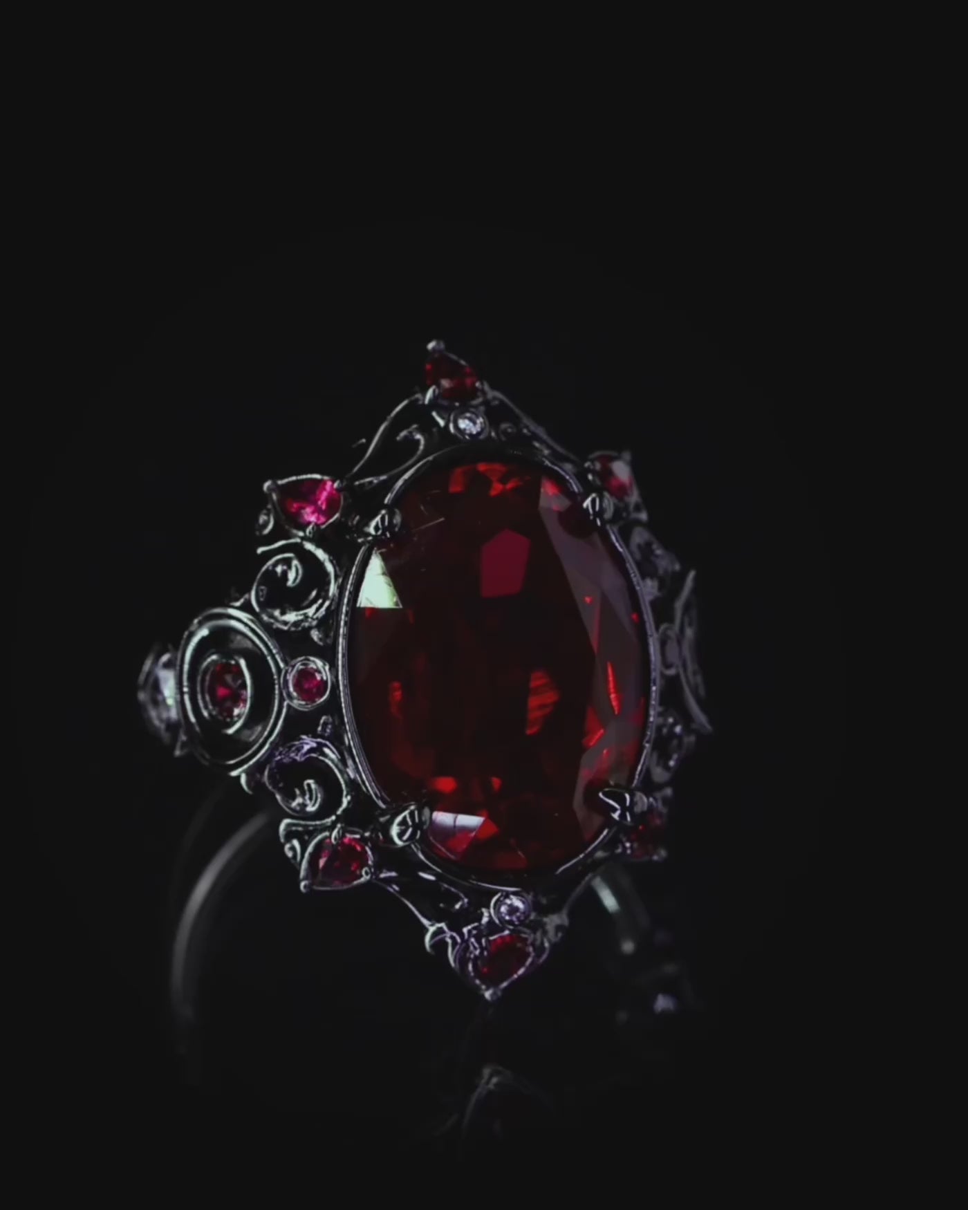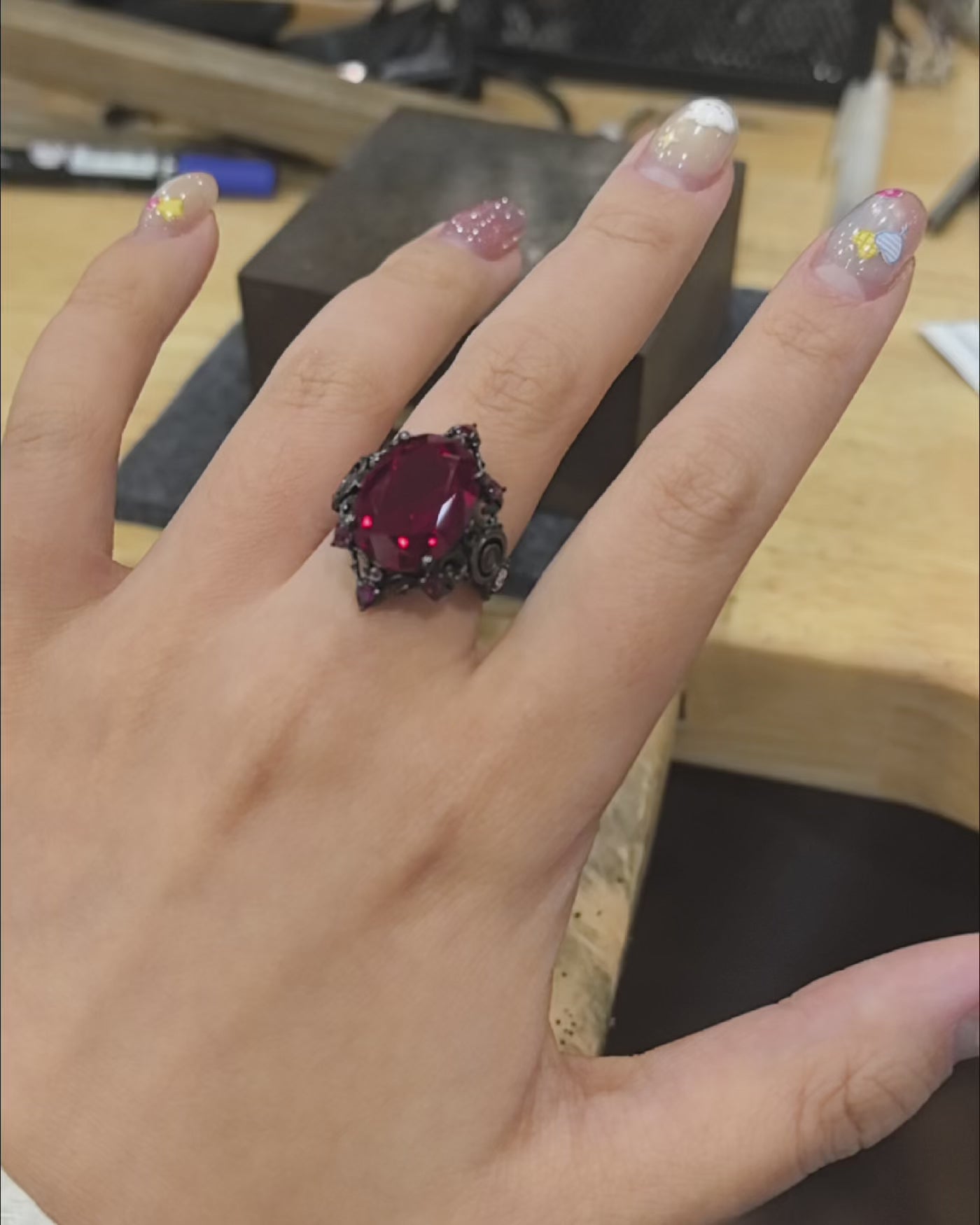 This ring is a tribute to the legendary gemstone Abyssal Mark, a ruby steeped in centuries-old lore. In the game's storyline, this gem is said to possess demonic power and a cursed history, with each of its past owners meeting a tragic fate. Lost for over a hundred years in the chaos of war and conflict, it remained shrouded in mystery. This ring features a stunning 14-carat lab-created ruby, meticulously cut and polished to replicate the brilliance and depth of a natural ruby. A recreation of a rare and storied treasure—who will be its next owner?