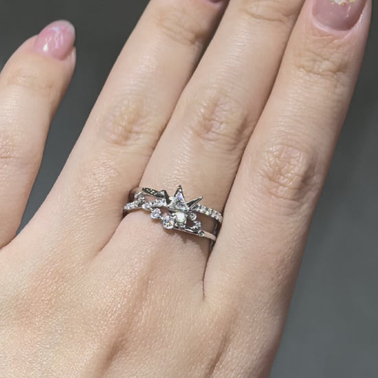This design centers around a delicate origami crane, set with a triangle-cut and a round moissanite stone. A symbol of unwavering devotion, it carries the quiet vow: “Even the endless sky. Somewhere. In this tangled fate. You are the answer.”