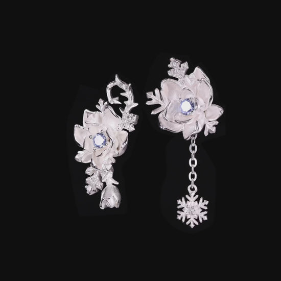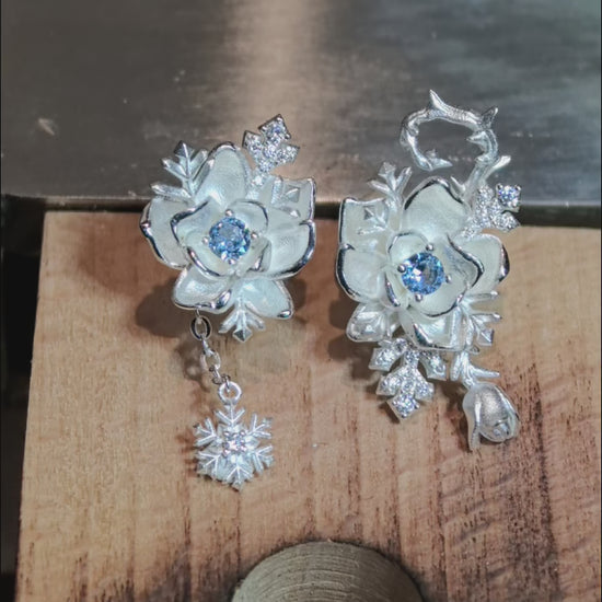 Inspired by symbolic elements tied to Zayne in Love and Deepspace, these earrings weave together thorns, snowflakes, and a blooming jasmine. Crafted with a special silver burnishing technique, the surface takes on a soft, snow-like texture. The jasmine flower blossoms delicately between ice and thorns—capturing the quiet resilience and gentle strength of winter.