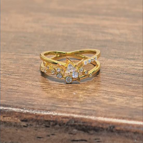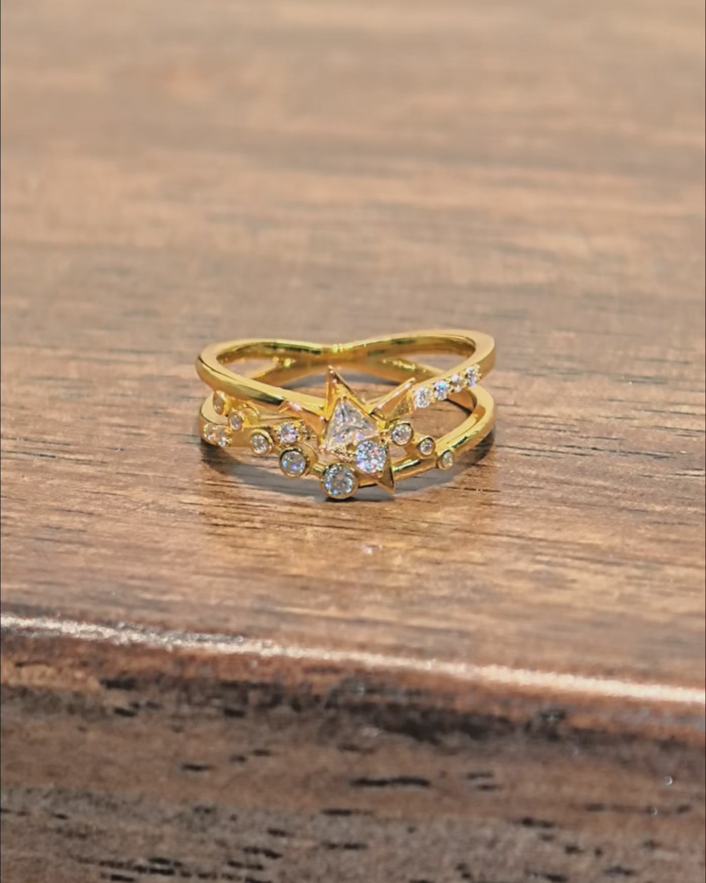 This design centers around a delicate origami crane, set with a triangle-cut and a round moissanite stone. A symbol of unwavering devotion, it carries the quiet vow: “Even the endless sky. Somewhere. In this tangled fate. You are the answer.”