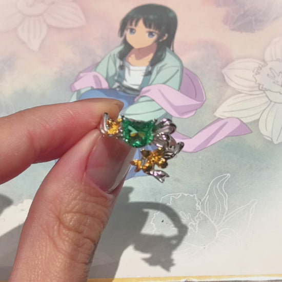 Inspired by Maomao from The Apothecary Diaries, this ring features a flowing ribbon band that wraps gently around the finger, lifting a cat-shaped green gemstone at its center. Delicate yellow herbal accents symbolize Maomao’s sharp intellect and healing nature, blending elegance with a touch of alchemical charm.