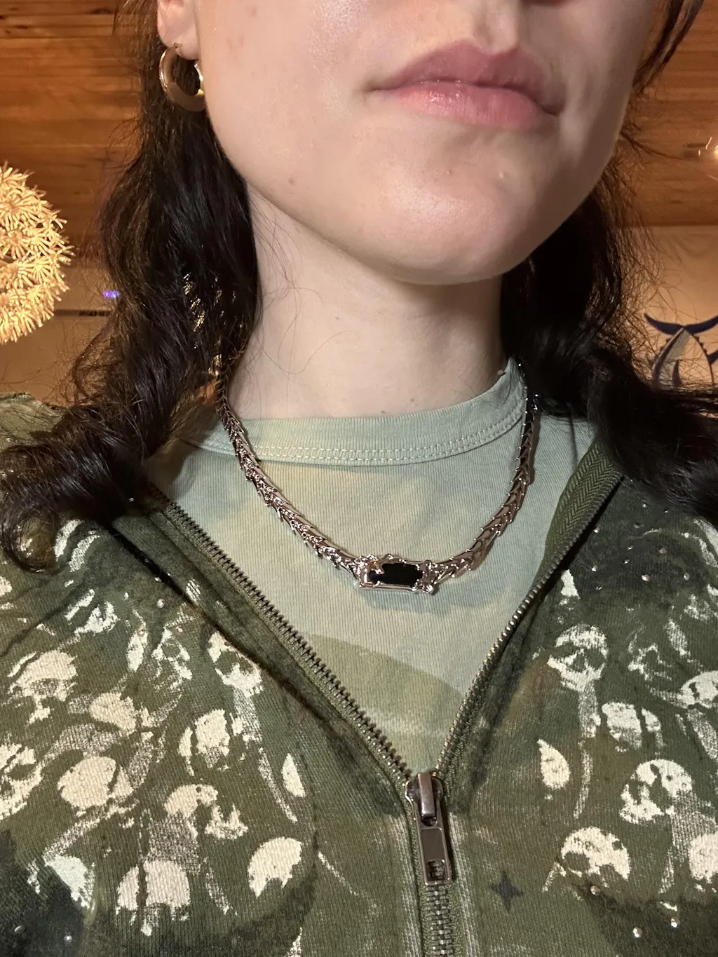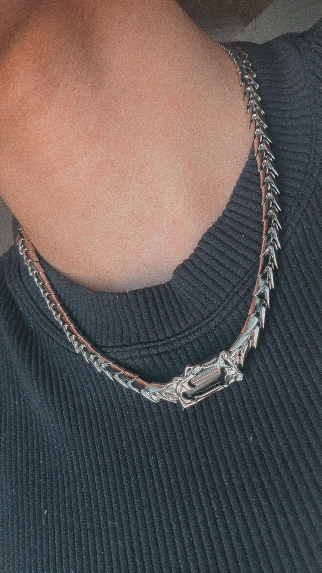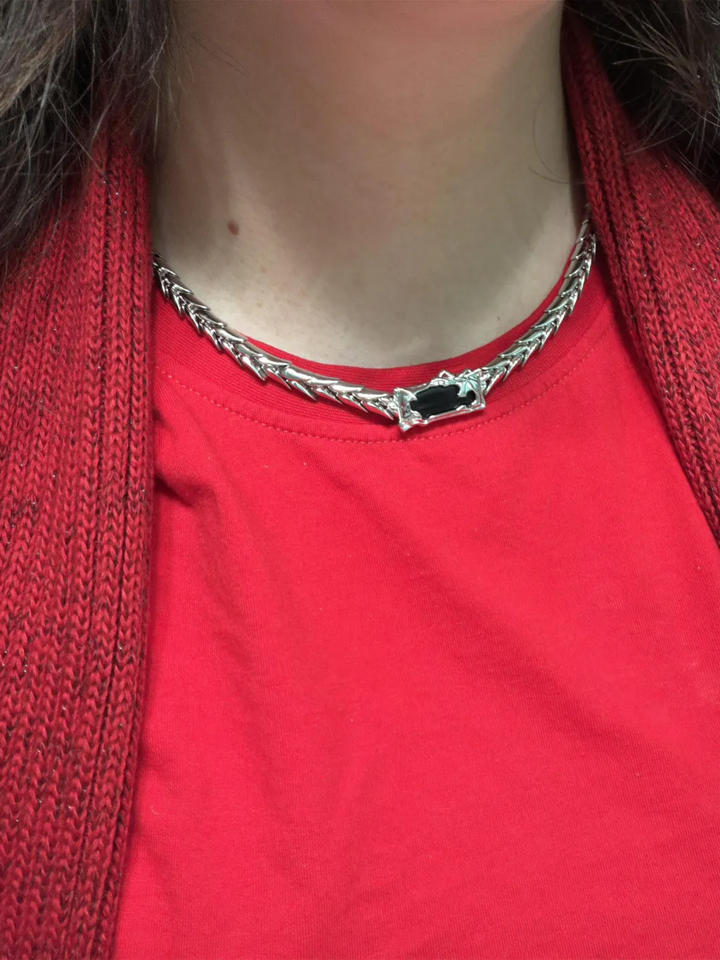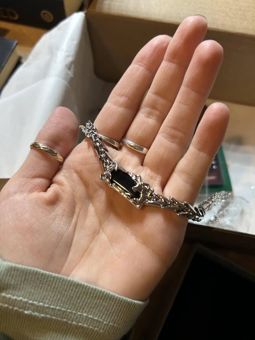 Inspired by Sylus’s look in Night of Secrecy from Love and Deepspace, this necklace mirrors the one he wears—sharp yet fluid, like a dragon’s scaled spine. At the center sits a deep black gemstone, echoing the one used in his Affinity Level 100 Ring. Mysterious and protective, it is said to ward off sorrow and bring quiet strength to its wearer.