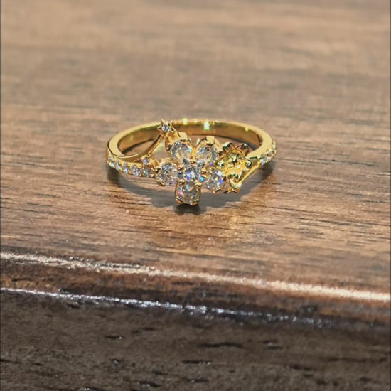 This design features a radiant starflower formed by five pear-cut moissanite stones encircling a central five-pointed star-shaped moissanite. Two tiny stars and a miniature starflower accent the band, adding layers of celestial detail. A promise written in the stars: “A shooting star crosses the sky where wavyleaf sea lavender blooms. Two stars shine together and become a vow.”