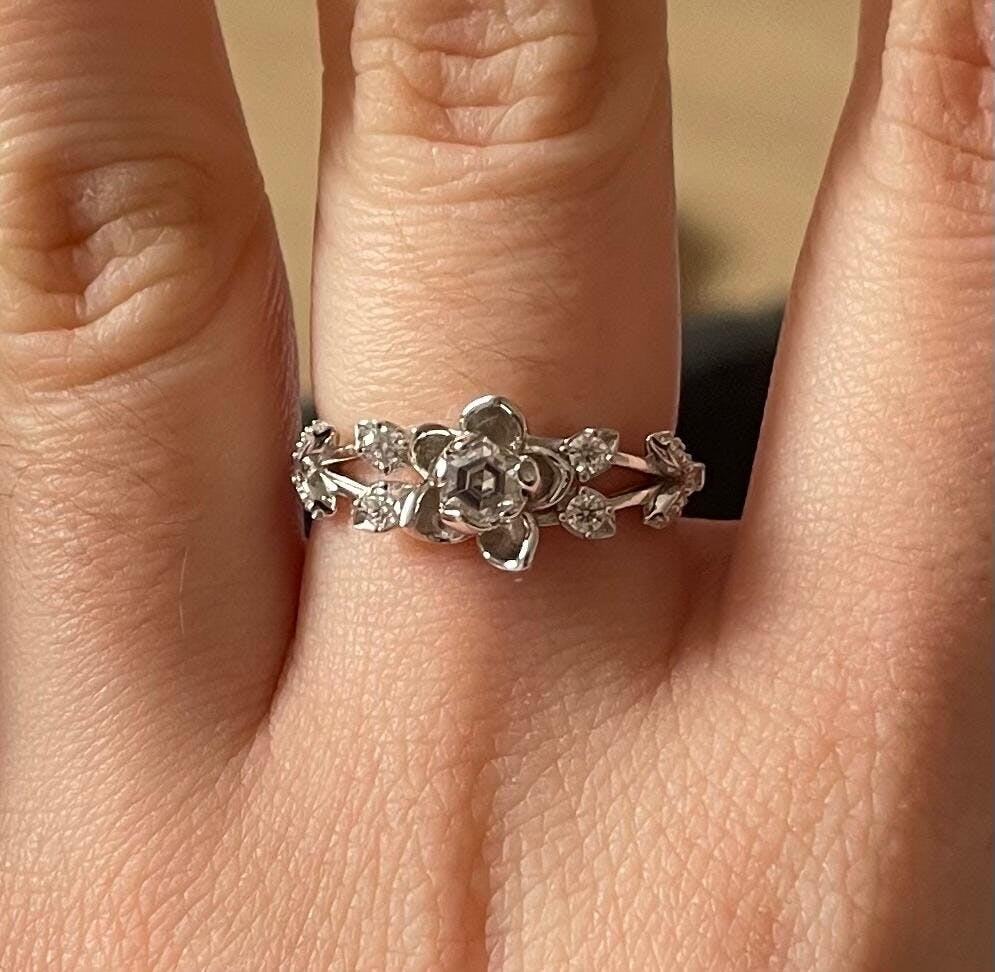 This ring features a delicate jasmine flower at its center, set with a hexagon-cut moissanite that resembles a frozen crystal. Jasmine leaves are intricately carved along the band, adding softness and symbolic meaning. A quiet vow that lingers like winter’s stillness: “The deepest wish is to stay together for all eternity, never letting go.”