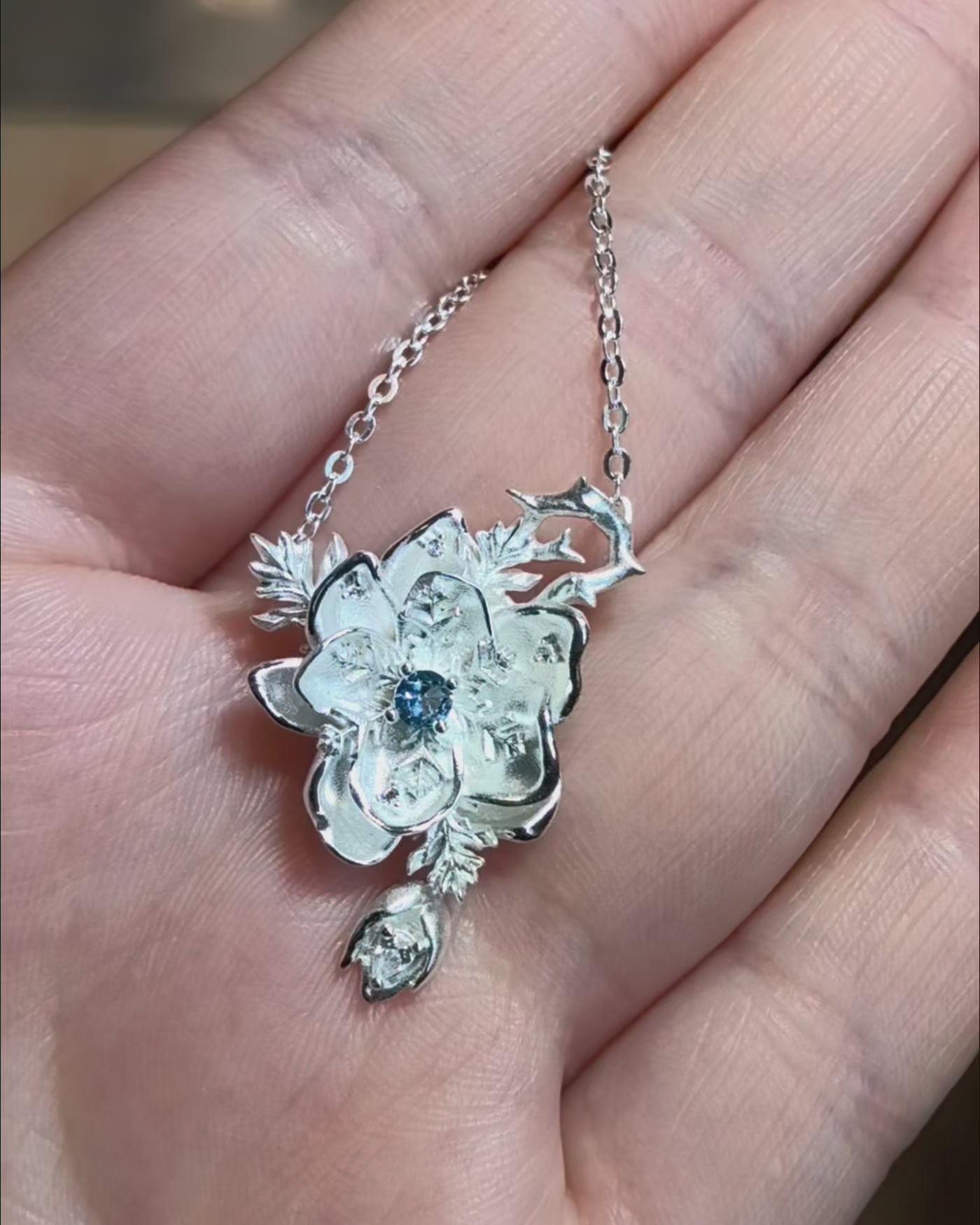 Inspired by symbolic elements tied to Zayne in Love and Deepspace, this necklace weaves together thorns, snowflakes, and a blooming jasmine. Crafted with a special silver burnishing technique, the surface takes on a soft, snow-like texture. The jasmine flower blossoms delicately between ice and thorns—capturing the quiet resilience and gentle strength of winter.