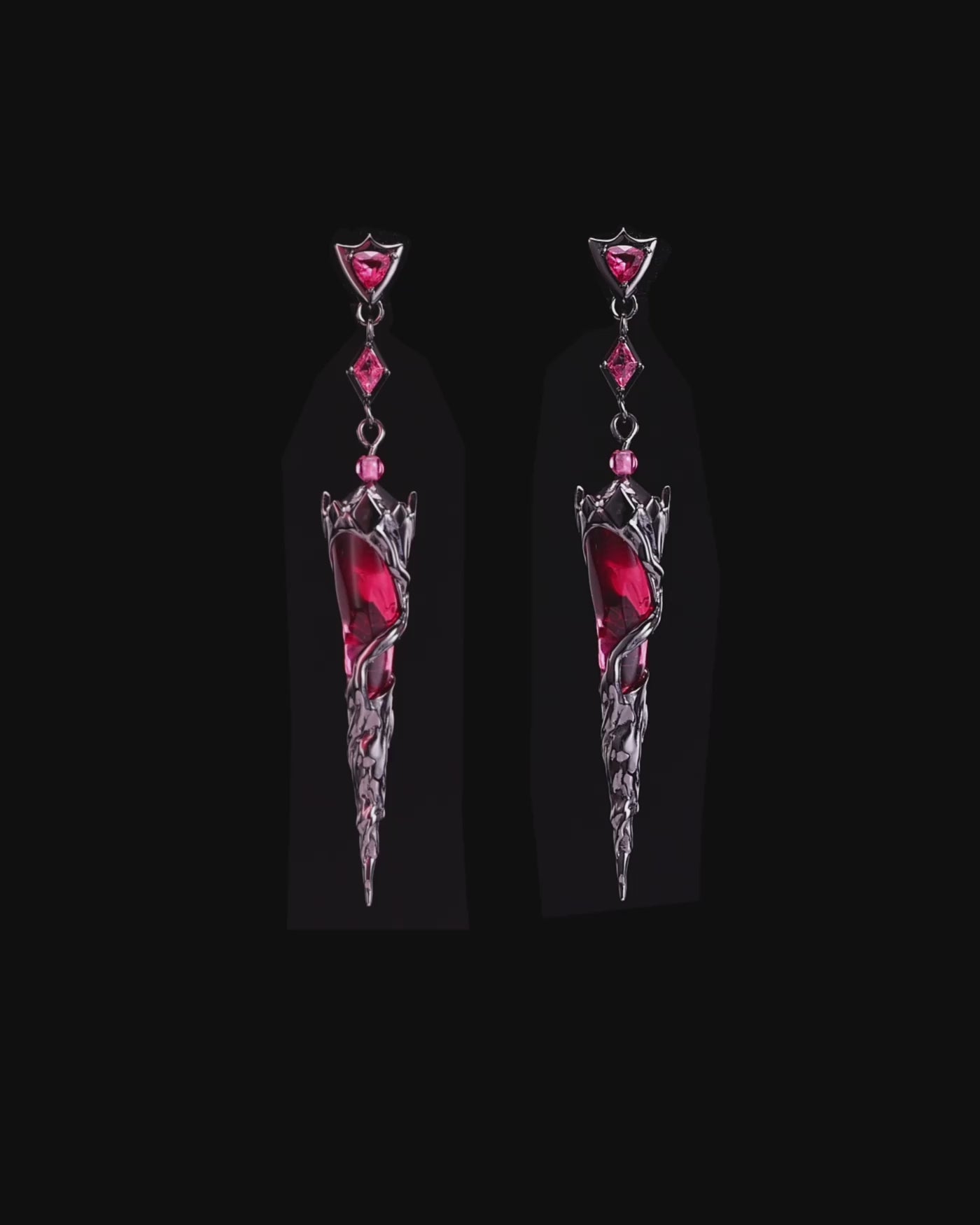 The design features an intricately cut, uniquely shaped lab-created ruby, radiating a sense of mystery and allure. This design is also available in a blue version.